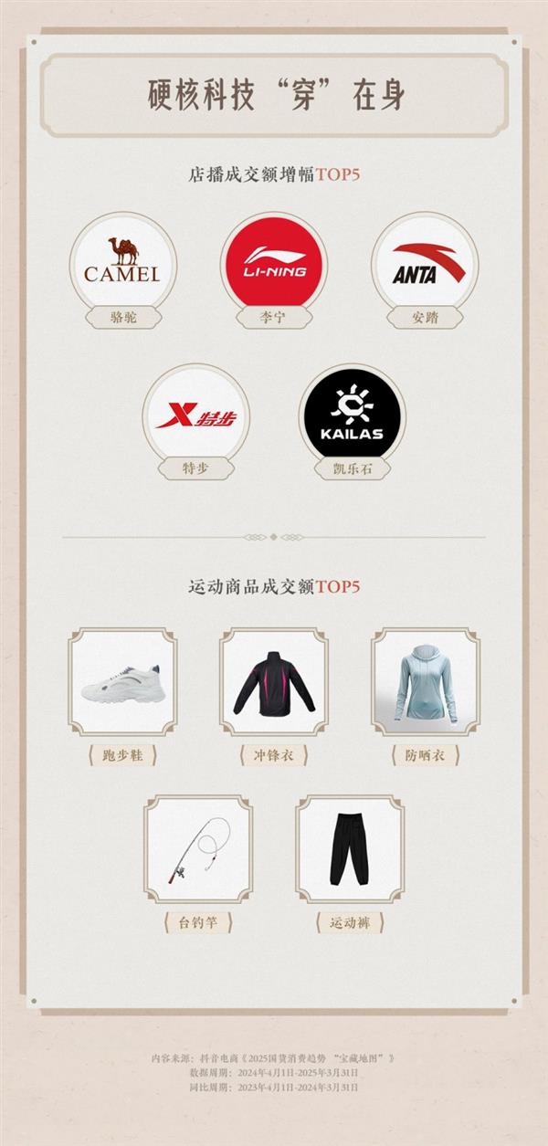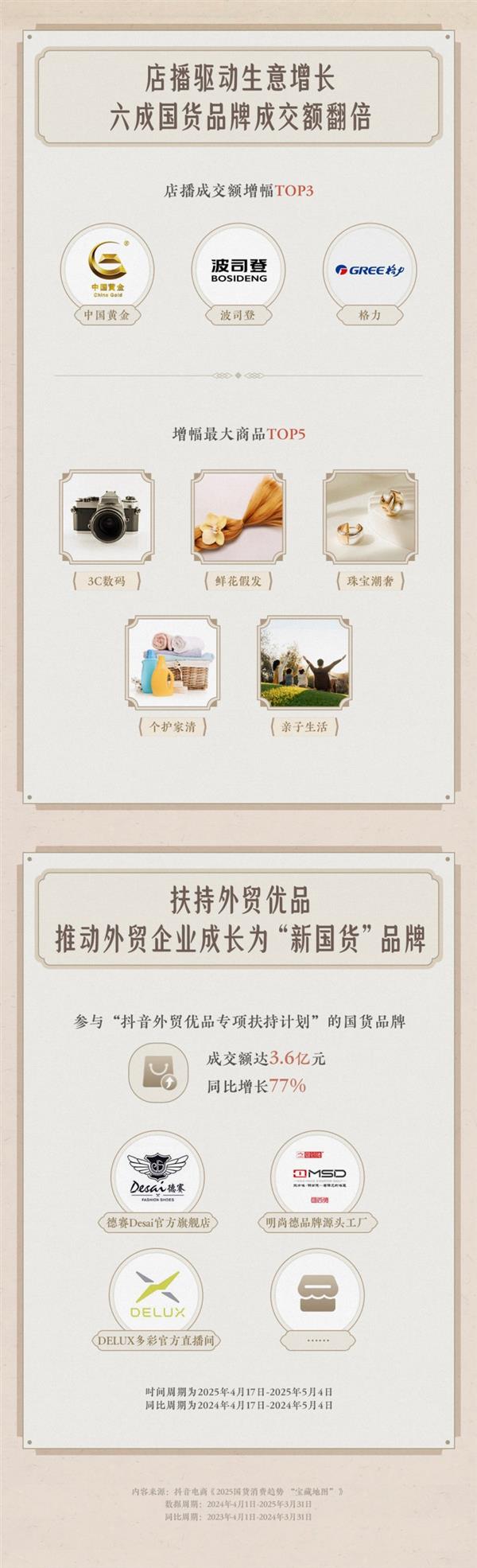 2025年5月10日,第九个中国品牌日到临之际,抖音电商发布《2025国货消费趋向 “宝藏地图”》。最新数据国货消费新趋向,店播带来好生意,六成国货物牌店播成交额同比翻倍。从科技立异的前沿阵地到苍生糊口的炊火日常,国货物牌正以簇新姿势沉塑消费款式,国货正以多元姿势抢占消费市场C位。抖音电商数据显示,六成国货物牌依托店播实现成交额翻倍。中国黄金、波司登、格力位居店播成交额增幅前三,3C数码、鲜花假发、珠宝潮奢等品类增加尤为亮眼。平台专项搀扶打算成效显著,2025年4月17日-5月4日,参取“抖音外贸优品专项搀扶打算”的国货物牌成交额达3。6亿元,同比增加77%,德赛Desai、明尚德、DELUX多彩等品牌通过全域乐趣电商带来的增量市场均衡外贸受阻冲击。此中,温州德赛鞋业极具代表性,这家从保守外贸代工场起步的企业,走出自从品牌之。面临外贸挑和,德赛判断海外客户不合理要求,积极开辟海外新市场,正在迪拜设立分公司,取葡萄牙客户签下2000万元订单。据悉,德赛即将推出 “100%中国”新品,选用国内同样面对外贸压力的企业原料,以财产互帮模式摸索成长新径。