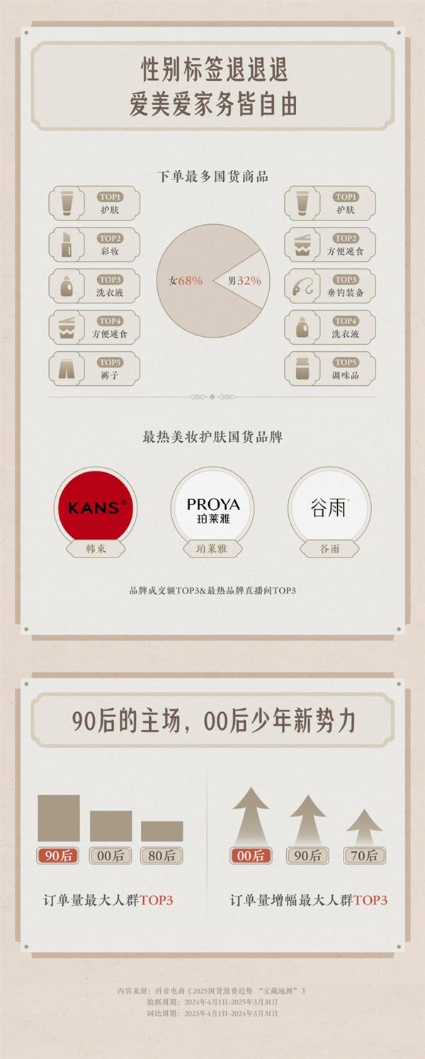 消费人群布局迭代特征较着,90后、00后已跃升为国货消费从力军,订单量稳居前二,此中00后订单增幅更是领跑各春秋段。值得关心的是,性别消费的鸿沟正逐渐消融,男女消费者正在护肤、便利速食、洗衣液等品类的爱好渐趋分歧。韩束、珀莱雅、谷雨等美妆品牌同时收成两性市场的承认,展示出国货消费的多元化潮水。