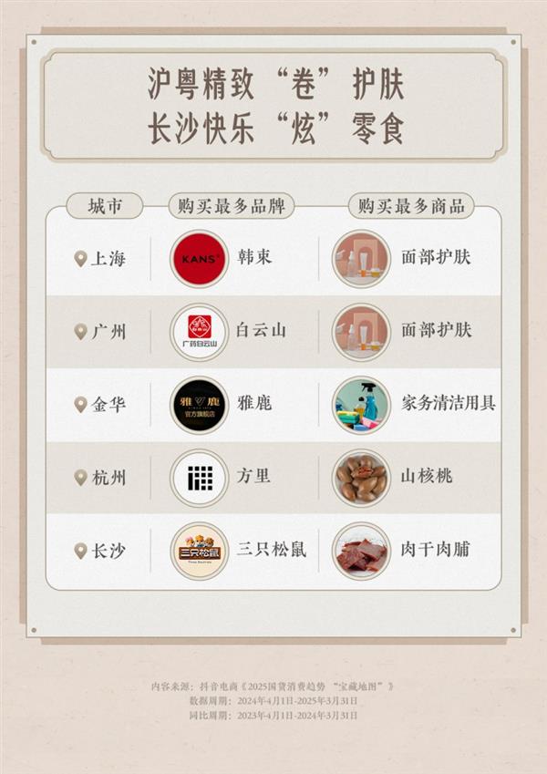 从地区维度看,消费偏好呈现显著差同化。正在上海、广州等时髦前沿城市,护肤品的热度持续处于高位,白云山、韩束等国货物牌备受消费者喜爱;长沙则掀起 “炫零食潮”,以肉干肉脯为代表的零食十分热销。义乌成为家务洁净用品消费高地,而杭州消费者对当地特产山核桃的偏好程度则位居前列。