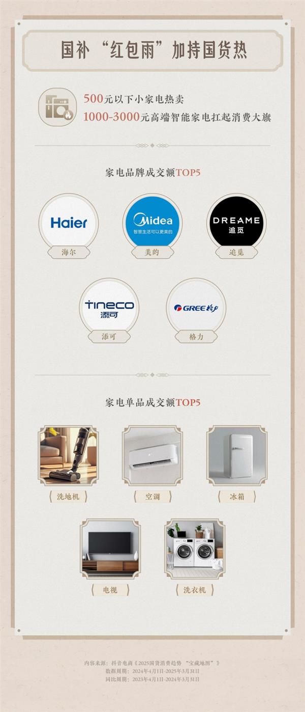 2025年1月20日起,抖音商城面向3C数码等商品启动国补上新勾当,笼盖家电12大类、数码3C、家拆厨卫等多品类数十万商品,通过曲播、短视频、货架等多元场景激发消费活力。抖音电商数据显示,国补政策显著拉动国货家电品牌热销。500元以下的高性价比小家电因其适用性,遭到浩繁消费者的青睐,成为家庭日常消费的抢手选择;1000-3000元的高端智能家电凭仗先辈的手艺和优良的体验,成为从销价钱区间,海尔、美的、逃觅、添可、格力等国货物牌稳居家电热销榜单前列,展示出国补政策鞭策下国货生态全面升级的强劲势头。