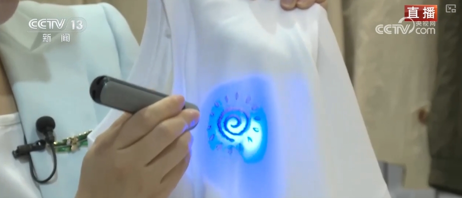 这件儿童T恤上的小太阳印花,采用“光感纱线”制做,摸起来并没有分歧,可是当用紫外线灯光映照后,这个印花就由白色变成紫色。儿童正在户外勾当时,能够提示家长及时给孩子做好防晒。如许的变色图案也多了几分童趣。